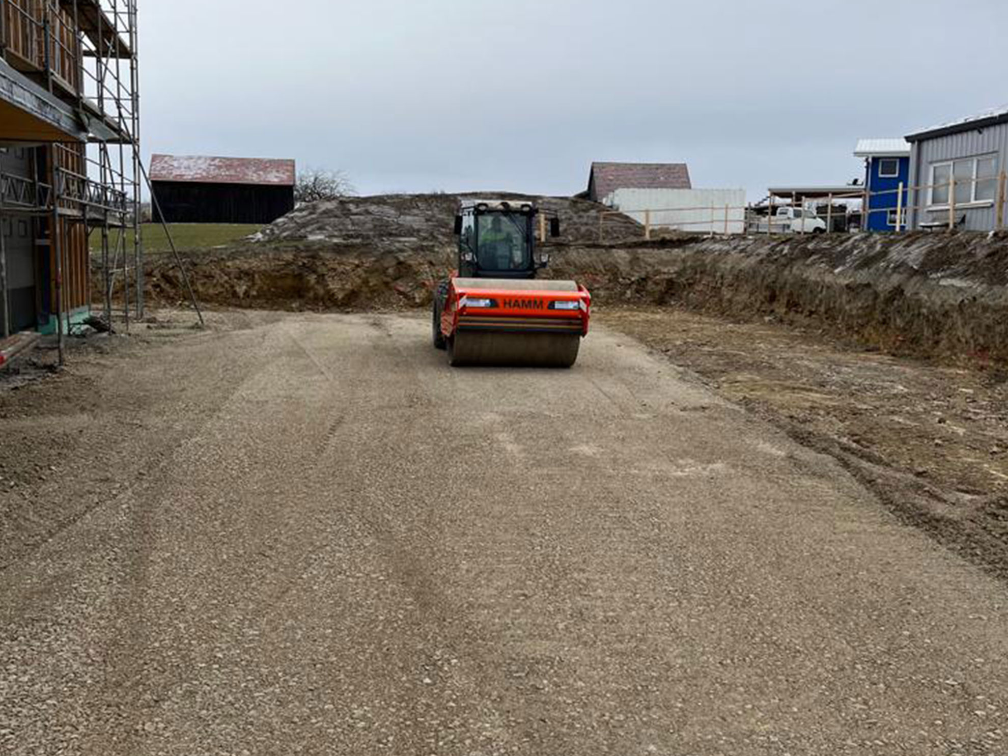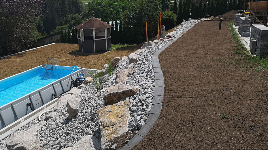 Das Einplanieren von Humus oder Schotter sowie das Einebnen von verschiedenen Flächen setzen wir für unsere Kunden fachgerecht um.